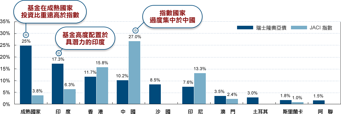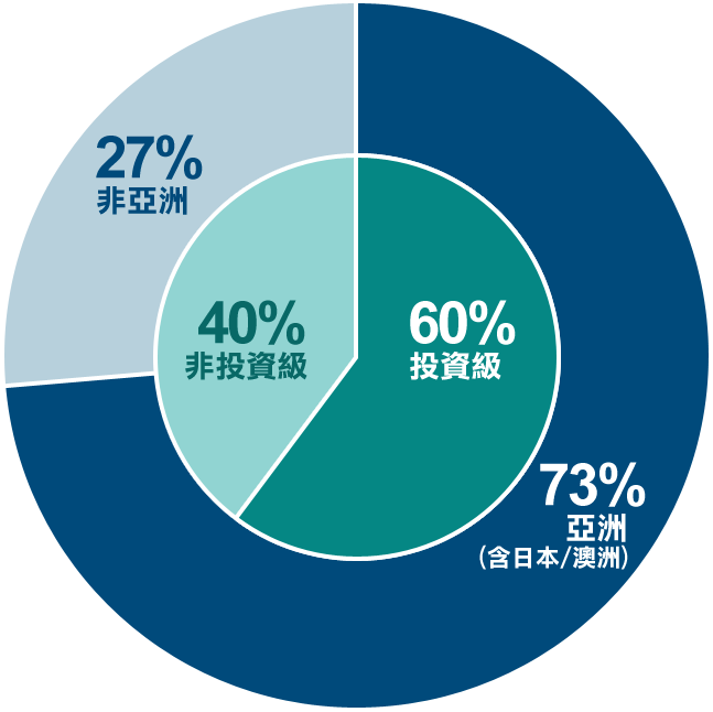 “6成以上投資等級債(信評BBB級以上)+與4成以下的非投資等級債(信評BB級以下)”和”7成以上的亞洲國家+3成以下的非亞洲國家”的投資配置,掌握信用市場投資機會。