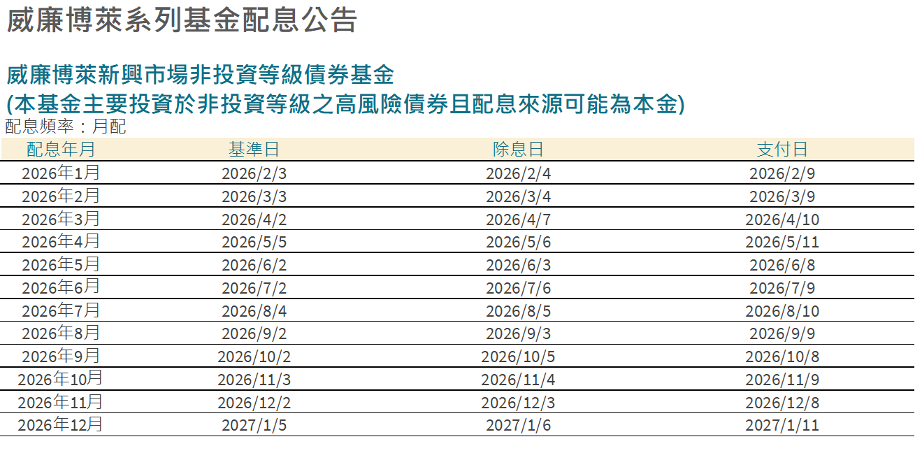 威廉博萊系列基金2026年配息公告