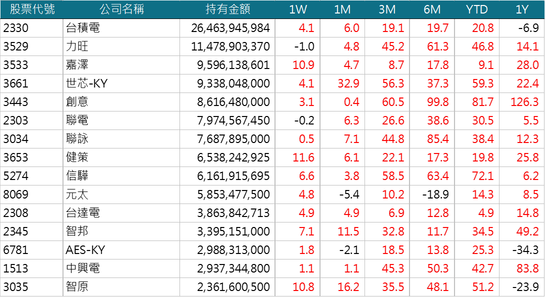 - 除前15名投信重點持股外,在前30名的穎崴、奇鋐、保瑞也都有單週20%的表現,台股三月以來已經進到百花齊放的狀態,的確很容易吸引到投資人繼續投入。只是市場風險情緒越高昂,個股投資也越是要慎選。