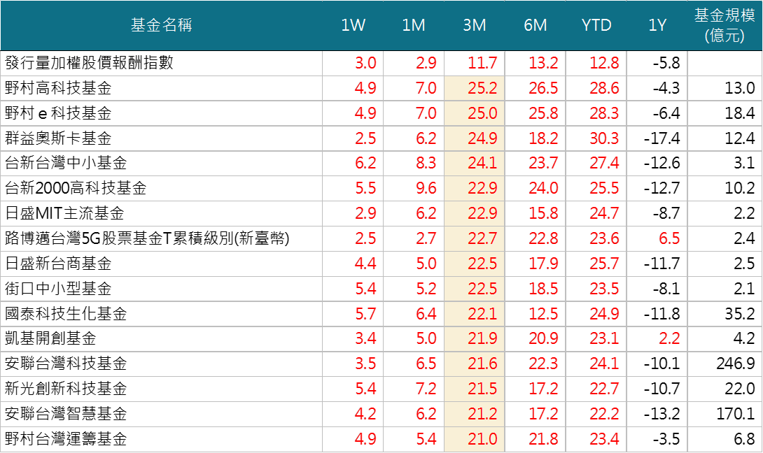 - 近一個月台股基金平均表現上漲4.6%,優於大盤的2.9%,上週在科技股走揚之下,台股基金繼續表現優於大盤。YTD台股基金平均上揚16.2%,相對大盤指數12.8%,在今年至今升息預期已全然消弭之下,美股科技成長股表現也引領台股。近三個月表現,野村、安聯、群益等三家老牌台股投信基金又開始擠進榜內,大小基金都有不同主題類股可以選擇投資。