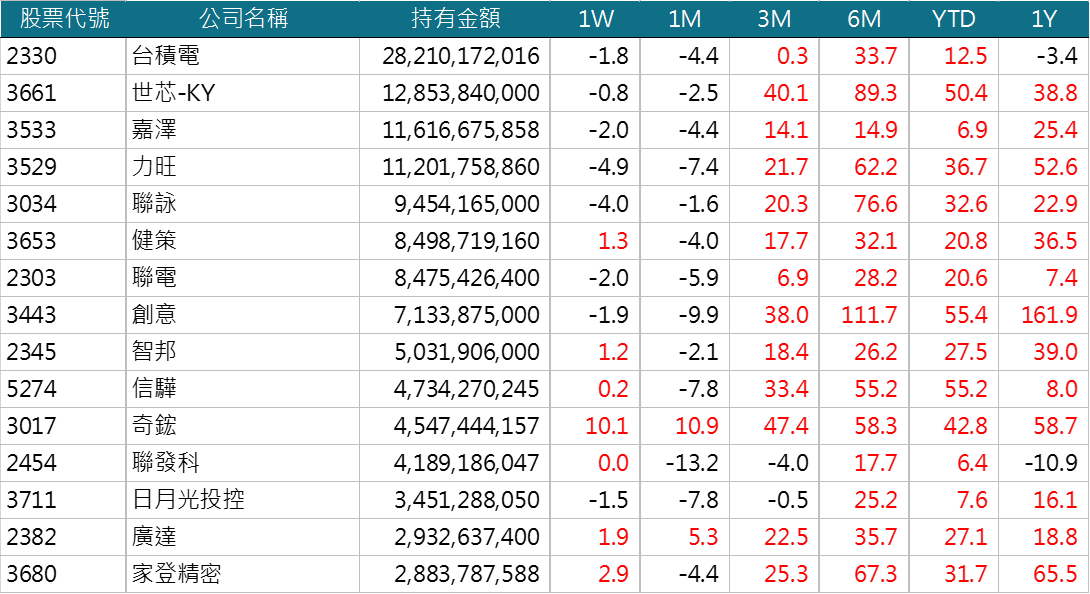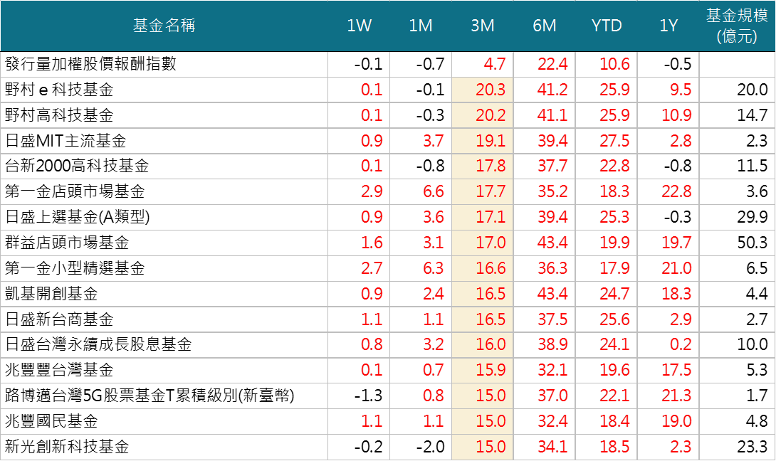 - 近一個月台股基金平均表現下跌1.3%,略後大盤的下跌0.7%,但若是績效表現前段的前15名台股基金,則是上漲2%,如前段所述,因為個股表現開始分歧,如何挑選依然強勢的重點持股也是績效分野。YTD台股基金平均上揚14.5%,雖依舊普遍優於大盤指數10.5%的表現,但整體outperform的表現已開始收斂,值得留意。
