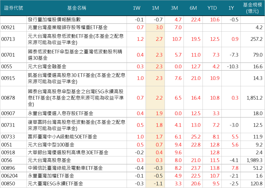 - 近期因台股走勢震盪,近一月高股息低波動ETF績效表現較佳,其中以00731元大台灣高股息低波動ETF、00701國泰臺灣低波動股利精選30 ETF最為出色,近一月報酬率為2.7%和2.3%明顯優於大盤-0.7%。