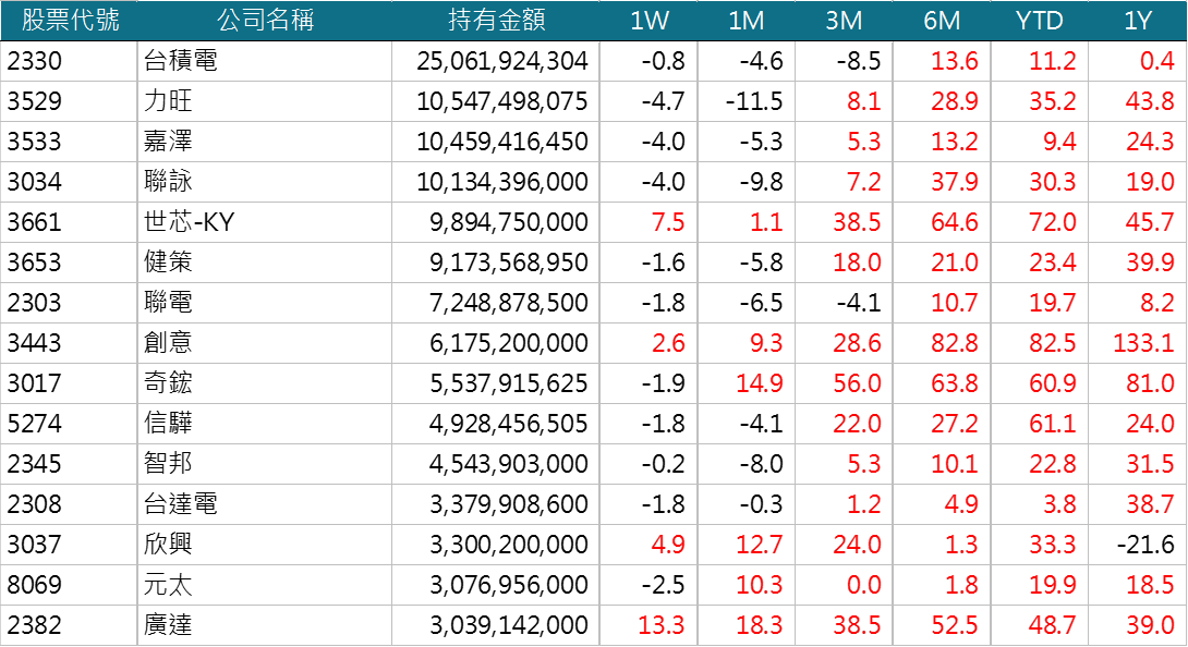 - 上周台股基金平均下跌1.4%,落後於大盤的下跌0.8%,近一個月台股基金平均表現下跌4.2%,也落後大盤的下跌2.6%,且表現為平盤至-10%,顯示許多基金重點持股都有一致性的大幅拉回。