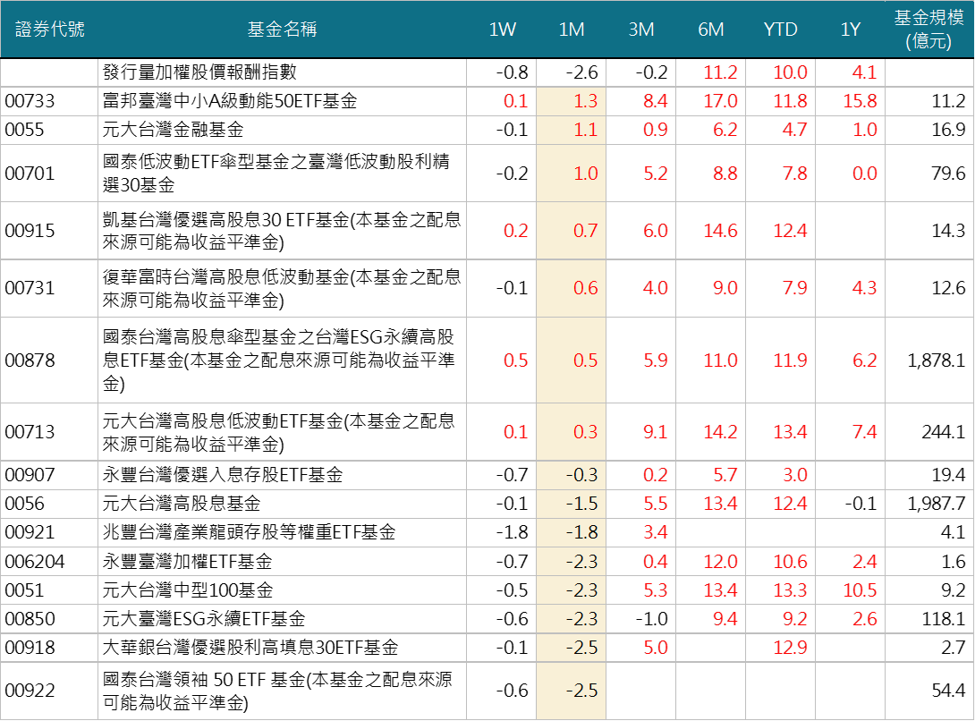 - 本週近一月績效排行榜與上週排行差異不大,在台股震盪盤勢下,「高股息」、「低波動」仍是抗震關鍵字,人氣ETF 00878 國泰台灣ESG永續高股息ETF上週績效為0.5%勝過大盤-0.8%,是所有台股ETF裡表現最佳的ETF。
