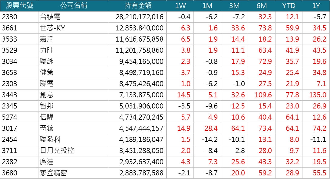 - 外資加重賣超台股,使得內資轉向中小型股,績效表現強過權值股,00733富邦台灣中小A級動能50ETF單週上漲3.3%、近一月上漲3.8%。