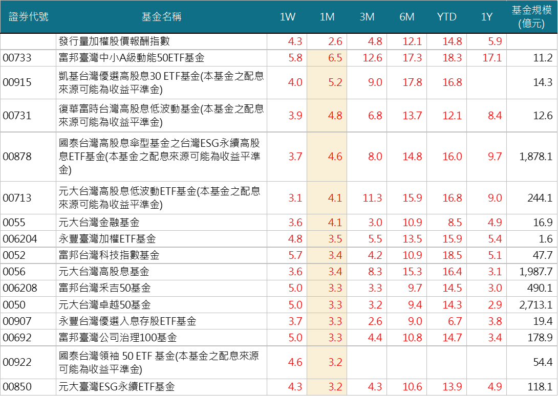 - 中小型股表現持續活潑,從00733富邦台灣中小A級動能50ETF的績效可看出,近一週、近一月、近三月、近六月、今年以來以及近一月,各天期報酬均勝大盤。