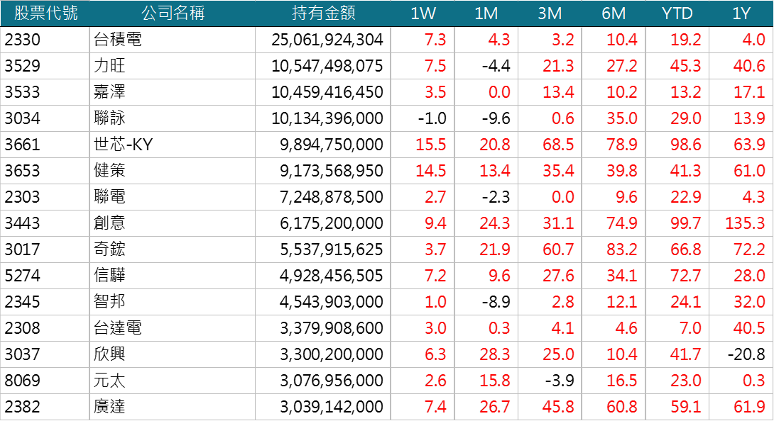 - 上週外資和自營商大舉買進台積電,台積電單週上漲7.3%,帶動台積電持股比重高的ETF績效。