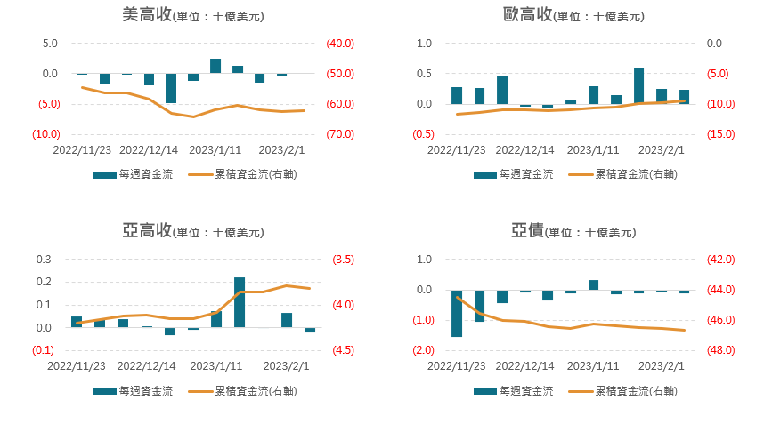 區域債市方面,值得注意的為歐高收,已連續6週買超 本週資金小幅流出亞高收和亞債