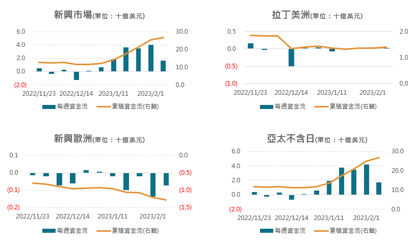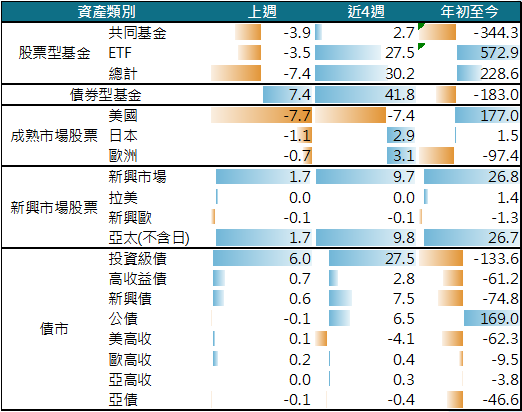 資金持續流入新興市場,然流入力道較上週減弱,主因流入亞太不含日的資金額下降