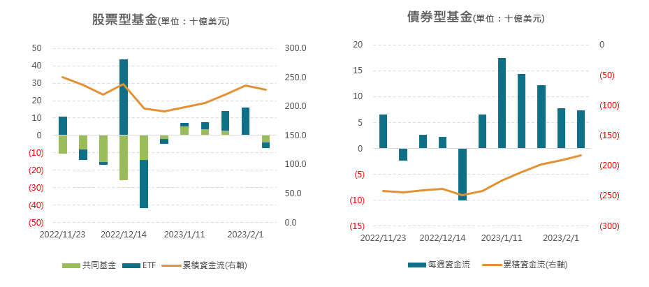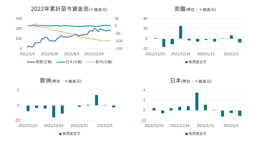 【統計期間2023/2/2-2023/2/8】終端利率預期提高加上中美緊張關係升溫等因素,市場風險情緒轉為謹慎,資金流出股票型基金和成熟市場股票。