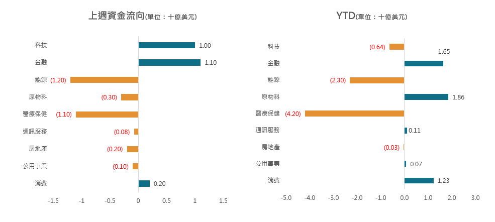金融類股為本週各產業之冠,且已連3週淨流入,能源類股轉賣超,為本週賣超最嚴重的產業類股