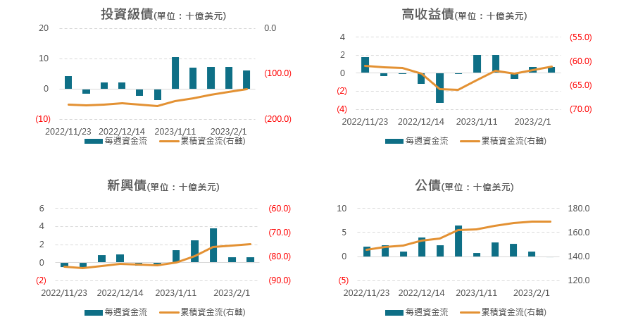 整體債市持續吸金,惟公債由買超轉為小幅賣超,投資級債連續5週買超,近幾週買超額相去不遠
