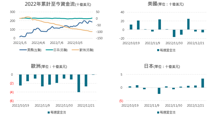2022年日股為淨流入且近幾週買超額增強,歐股過去一年最不受青睞,年度累計量大幅低於美股及日股