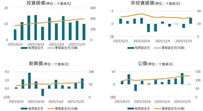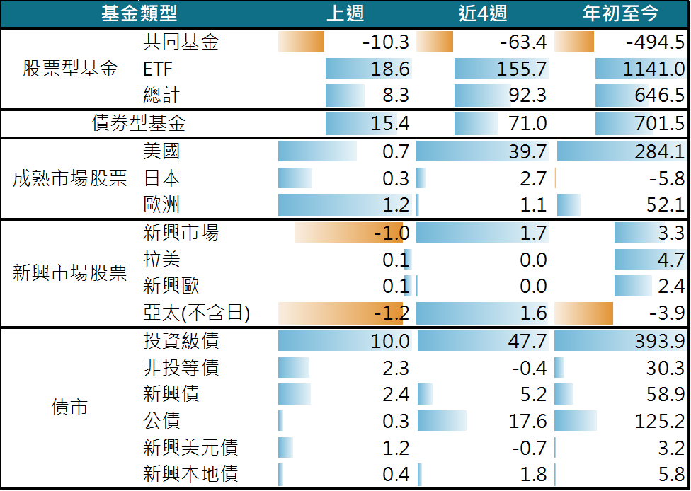 非投資級債終結連3週淨流出,上週淨流入23億美元;新興債連6週淨流入,且流入金額創近9週新高。
