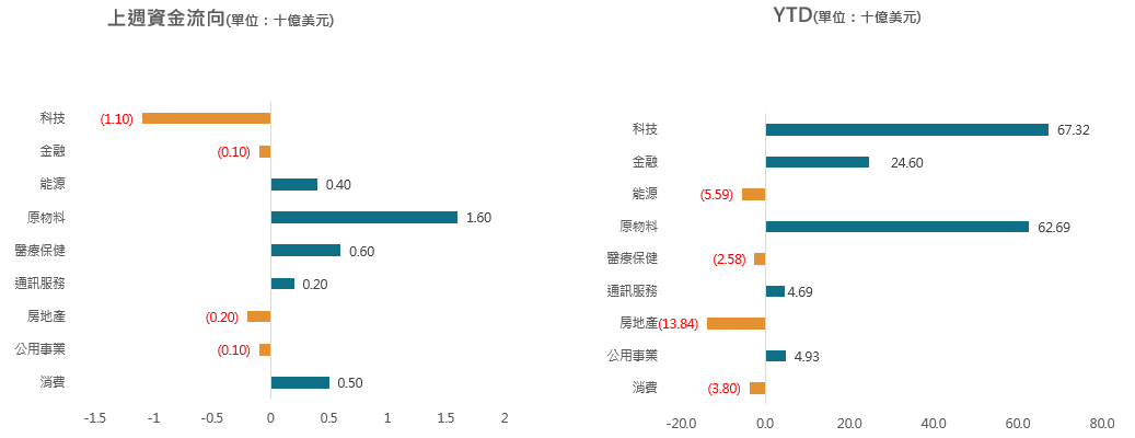 上週以原物料類股流入16億美元居冠,且流入額創近7週來新高;科技股淨流出11億美元,為今年6月以來最大的淨流出額。