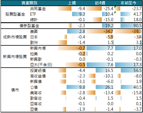 共同基金持續賣超,使整體股票型基金連4週淨流出,債券型基金今年第一次由買轉為賣超