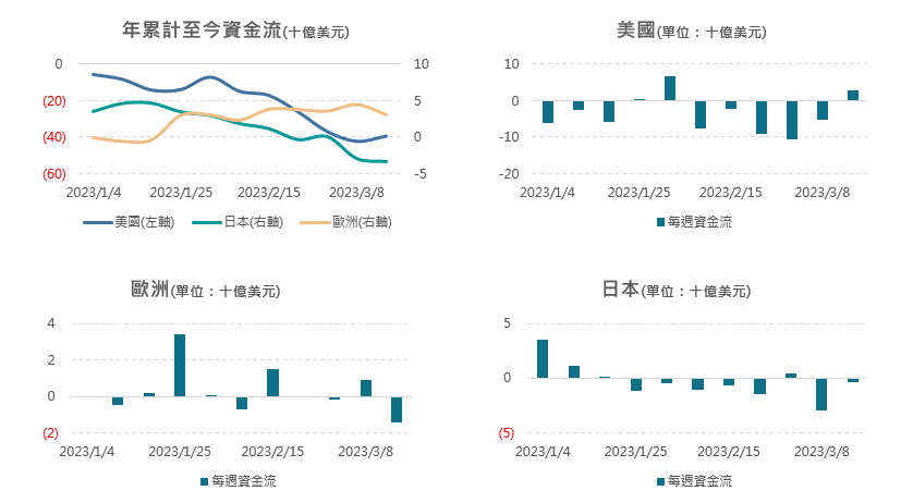 【統計期間2023/3/9-2023/3/15】美國矽谷銀行和瑞士信貸危機延燒,投資人避險情緒升溫,資金流出股票和債券型基金,唯美股和公債獲資金青睞。