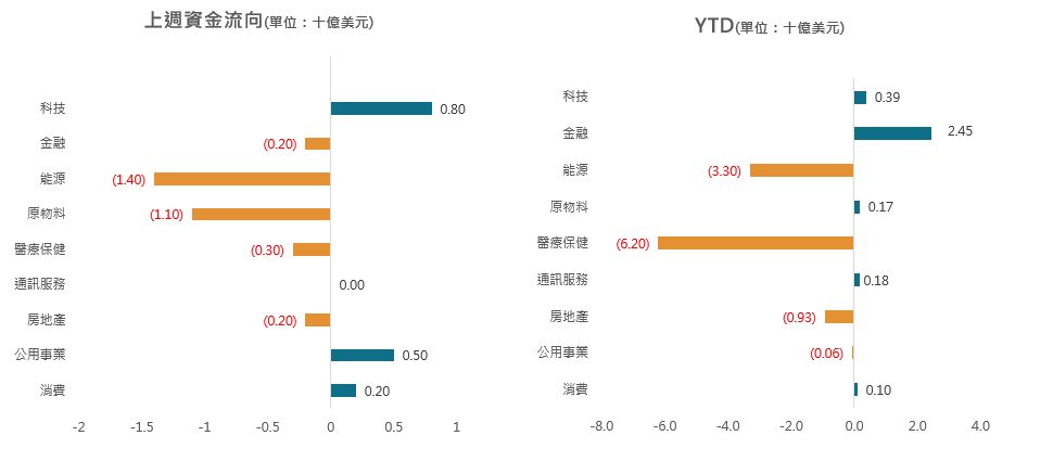 能源由買轉賣,且賣超額創各產業之冠,科技類股吸引資金,連續4週淨流入