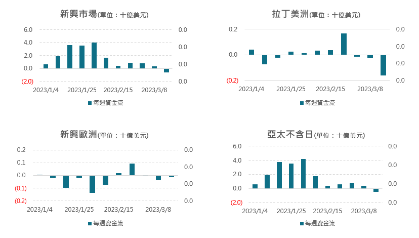 本週資金外流新興市場,亞太不含日連週買超後轉賣超,且拉丁美洲大幅賣超,賣超金額創去年12月中以來新高