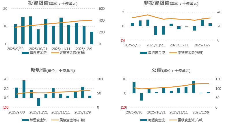 非投資級債和公債皆錄得連2週淨流入;新興債連7週淨流入,惟流入金額縮窄。