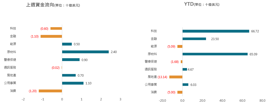 房地產淨流入7億美元,創2024年10月以來新高;金融股淨流出11億美元,創今年5月來新高。