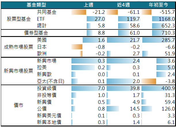 股票資產連12週淨流入,整體淨流入規模連2週下降;債券資產連32週淨流入,惟淨流入規模連4週下滑。