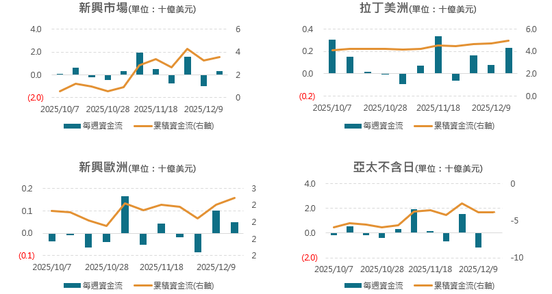 新興市場各區域皆呈現淨流入,以拉美的淨流入額居冠;新興歐連2週淨流入惟力道放緩,新興亞太由賣轉買。