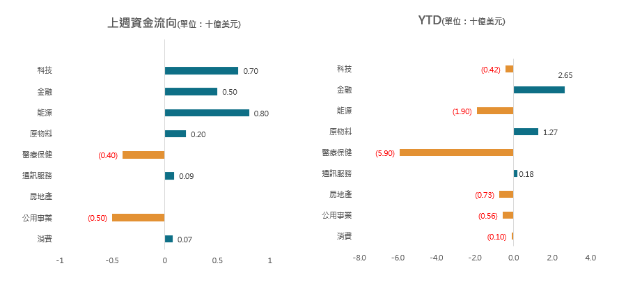 能源和科技類股本週獲資金青睞,且均連3週買超,醫療保健類股連週賣超,為年至今賣超最嚴重的產業