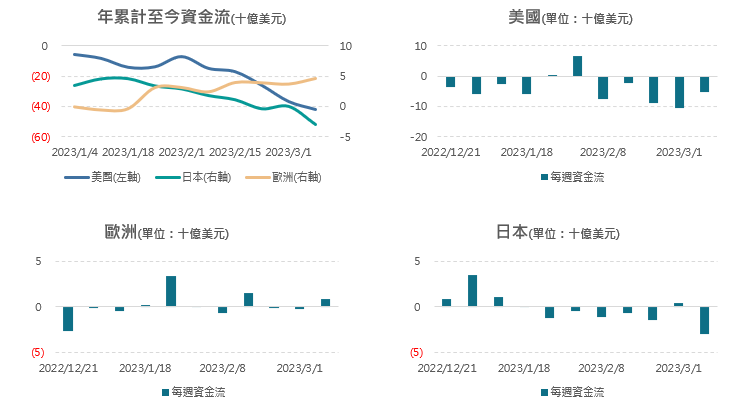 【統計期間2023/3/2-2023/3/8】美國2月非農就業熱於預期,FED聽證會重燃市場升息擔憂,全球風險性資產週收低,資金流出美股,持續注入債市。