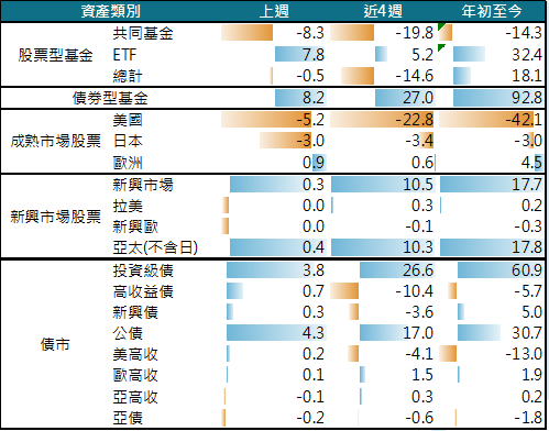 股票型基金連續3週淨流出,然ETF由賣轉買超,資金持續流入債券型基金,本週淨流入量與前週相近