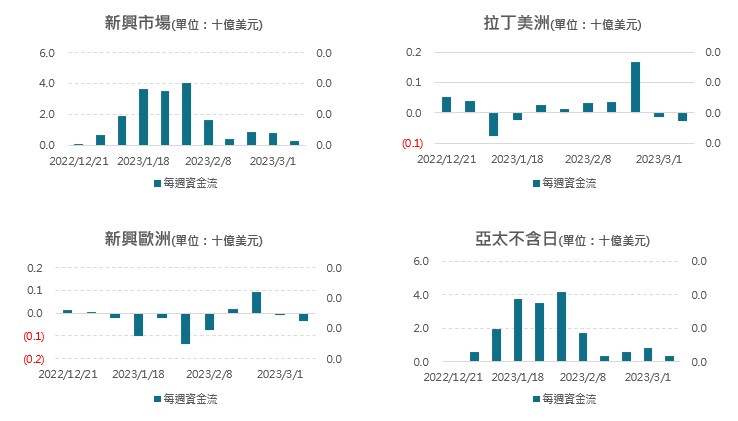 由於流入亞太不含日的資金額力道減弱,近4週新興市場的總買超額較1、2月大幅減少
