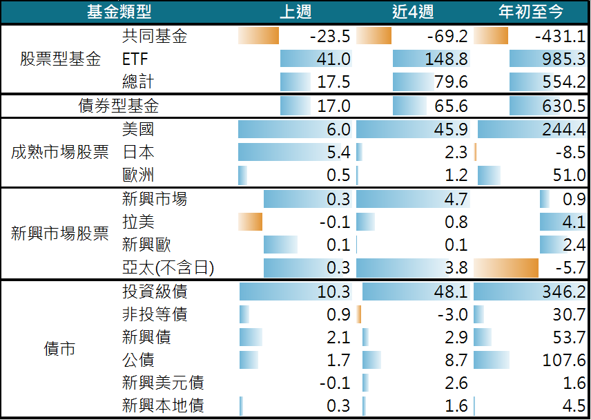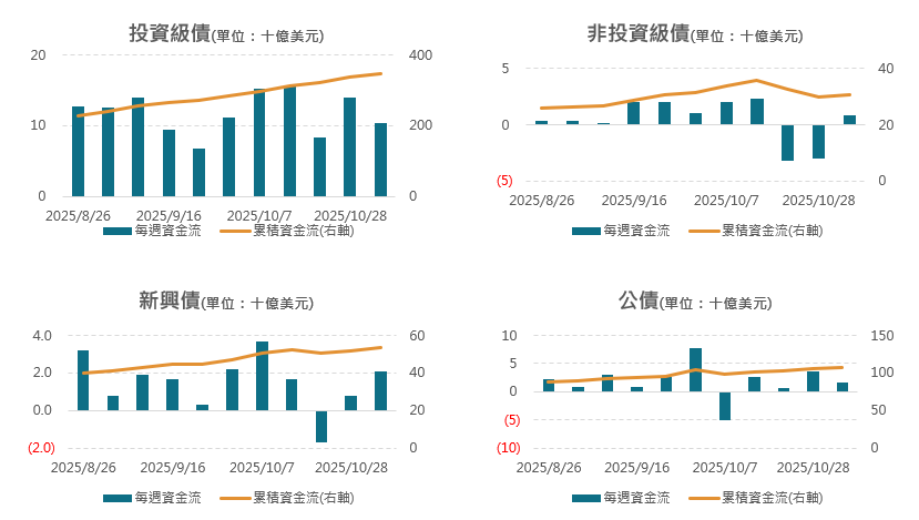 投資級債淨流入趨勢延續,非投資級債由賣轉買;新興債連2週淨流入,公債連4週淨流入,惟規模較前週減半。