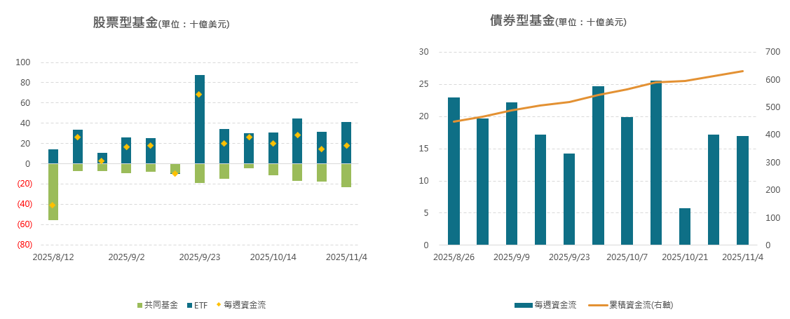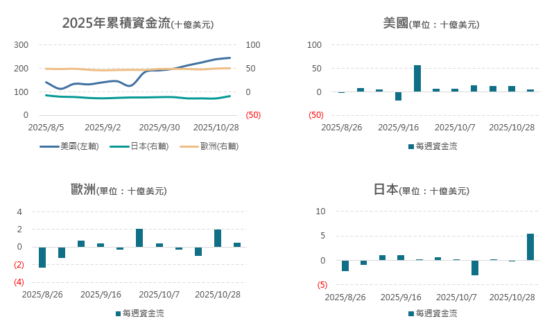 【2025/10/23-2025/10/29】股票資產多呈淨流入,日本股市現鉅額淨流入;債券資產多呈淨流入,僅新興美元債微幅淨流出。