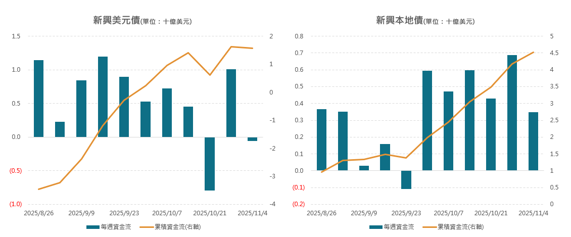 新興美元債由買轉賣,惟淨流出規模甚微;新興本地債連6週淨流入,今年累積淨流入規模突破45億。