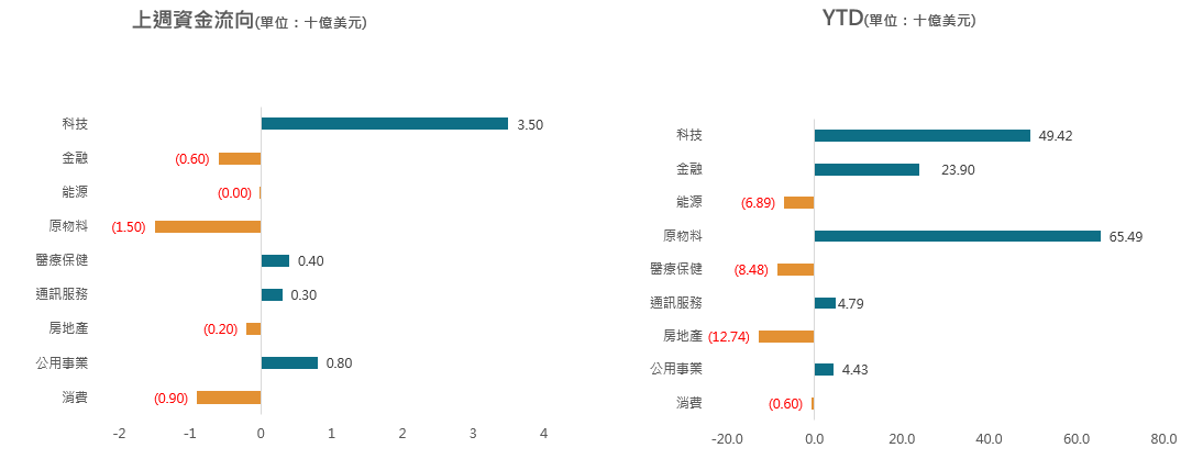上週各類股表現不一,科技類股再現大額淨流入;原物料類股則現大額淨流出,終結連10週淨流入趨勢。