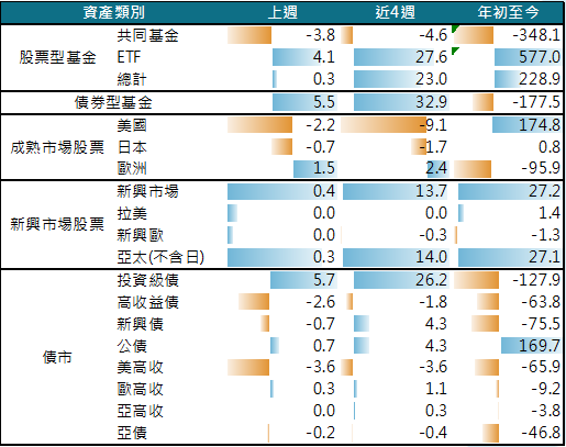 雖股票型基金ETF轉為淨流入,然投資人情緒謹慎資金流入量不高,資金持續流入債券型基金,惟流入量連週轉弱