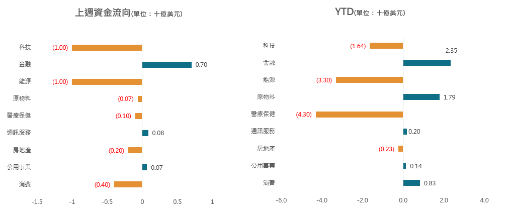 金融類股連續2週創各產業之冠,已連4週淨流入,科技類股由買轉賣,能源類股連續2週賣超