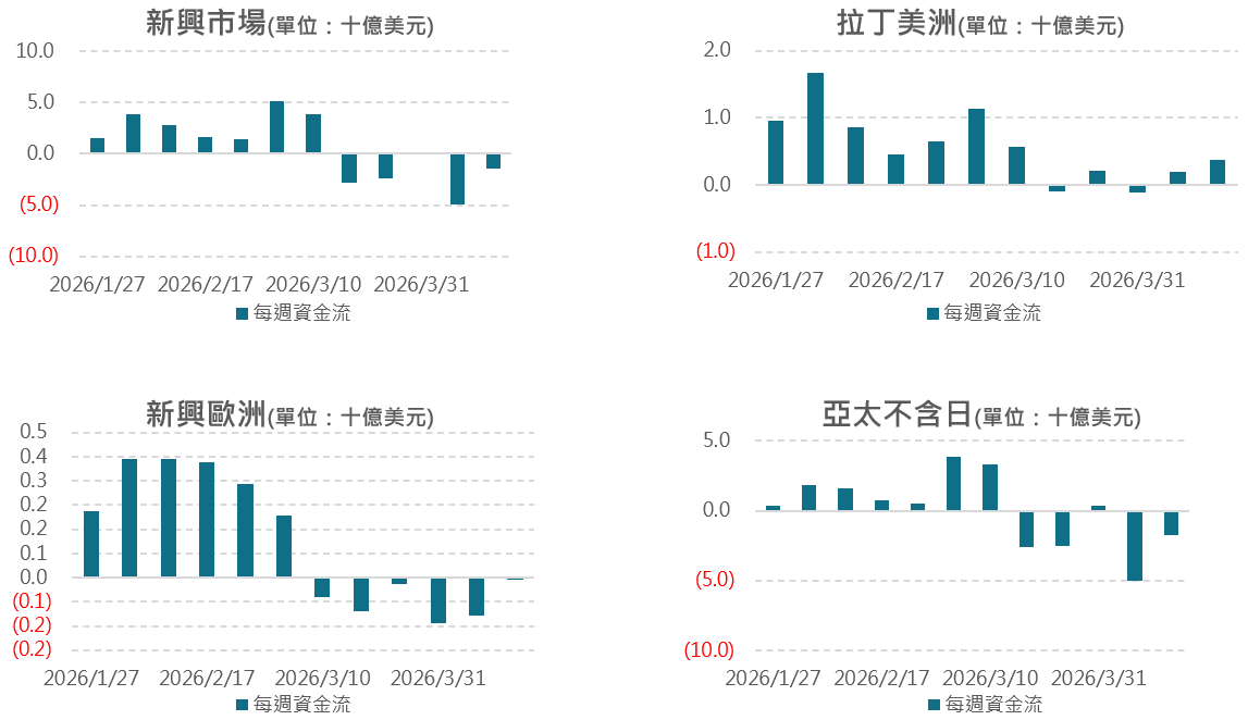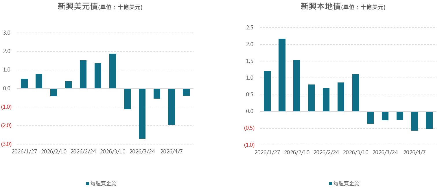 新興美元債連續5週淨流出,金額再縮減至4億美元;新興本地債亦達連續5週淨流出,金額約持平於5.2億美元。