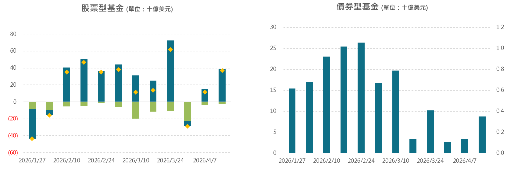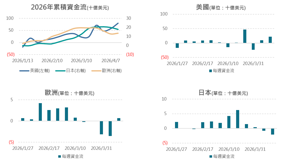 【2026/4/2-2026/4/8】主要股債市上週資金整體延續淨流入,股市資金持續回流美國;債券資金持續流入公債避險,非投等債轉為淨流入。