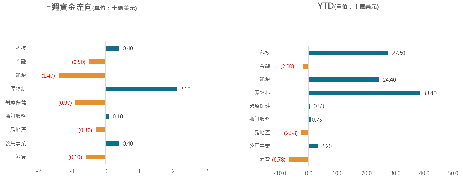 美伊仍待停火談判達共識,原物料延續淨流入21億美元;能源類股轉為淨流出14億美元,且淨流出金額居前。