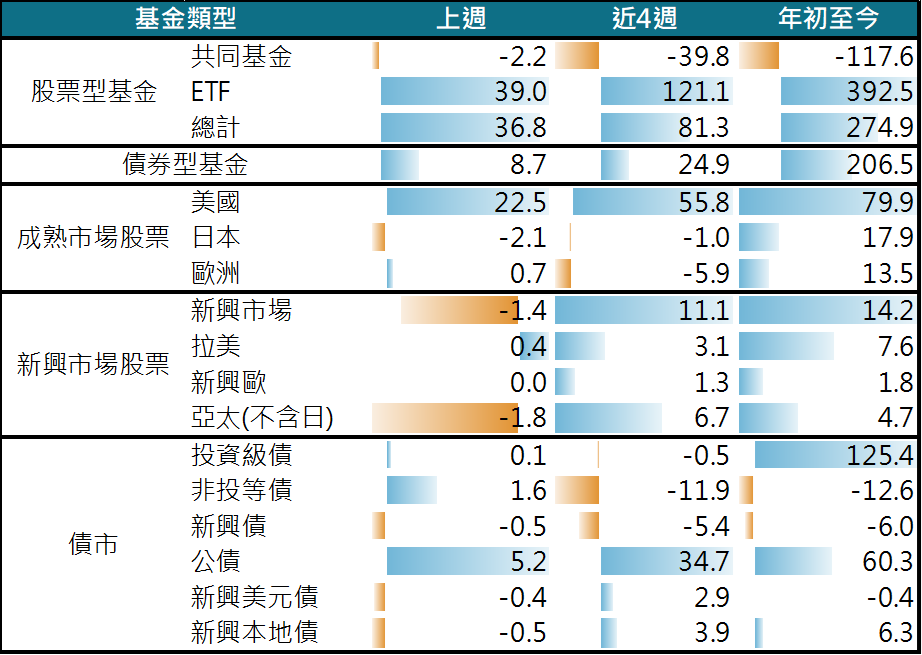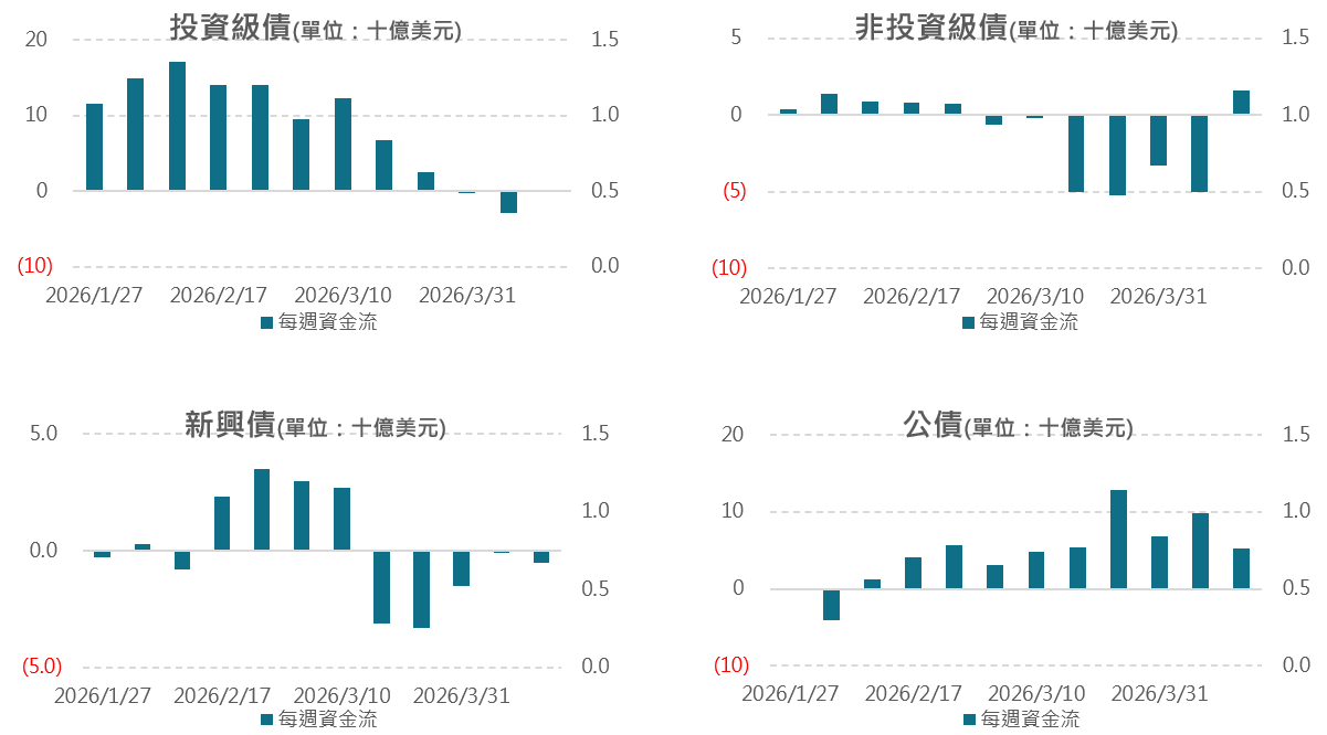 投資級債終止連續2週淨流出,惟淨流入金額僅1億美元;非投資級債終止連續4週淨流出,公債獲資金持續10週淨流入。