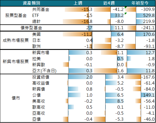 近兩週資金流出股票型基金,且流出金額擴大,債券部分考量市場已消化負面消息,獲得資金流入