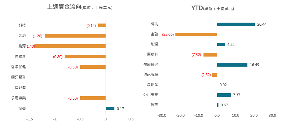 資金流續2週流出能源類股,進週單週賣超14億美元,醫療保健類股在連7週買超後,在上週轉為賣超
