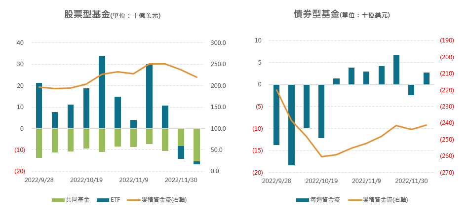 【統計期間2022/12/1-2022/12/7】美10 年債與 2 年債殖利率倒掛利差擴大,創40多年以來紀錄,引發投資人對未來景氣擔憂,資金連週遠離股票基金。