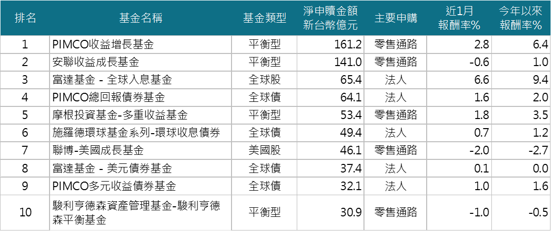 前10大淨申購基金以固定收益和平衡型基金為主,零售通路和法人皆有申購