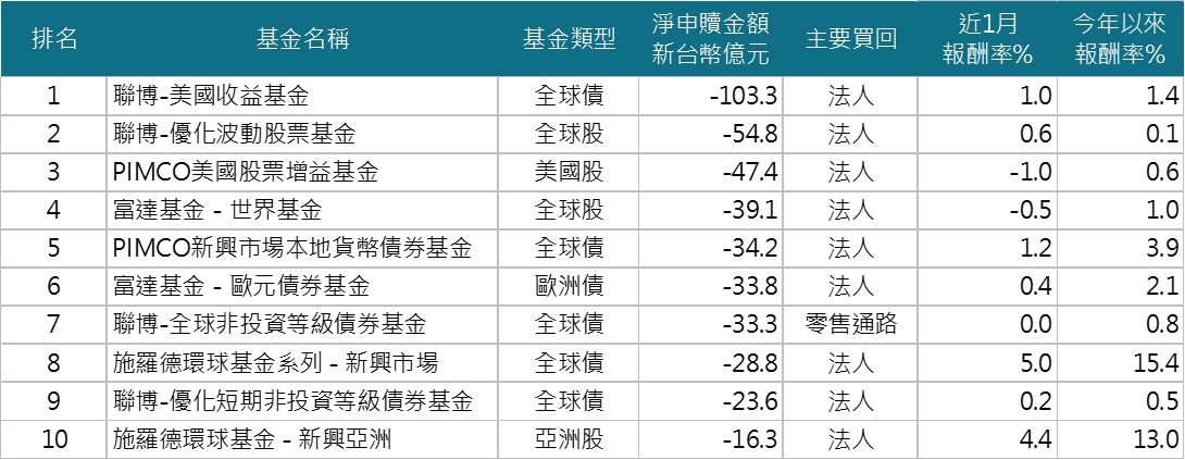 主要由法人贖回,以全球債券基金為主