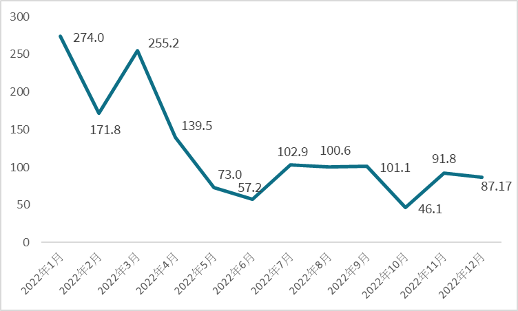 2022年全年度淨申購排行第一名的基金,不意外的仍是散戶長年熱愛的安聯收益成長基金,其淨申購金額高達1500.4億元,其餘前九大基金淨申購金額「加總」仍不敵一檔安聯收益成長基金,該基金整年度的報酬率為-19.7%,散戶仍不斷持續申購,只不過淨值一路向下讓散戶逐漸失去信心,淨申購金額在年初時最高為274億元降至最低點46.1億元(如下圖所示)。