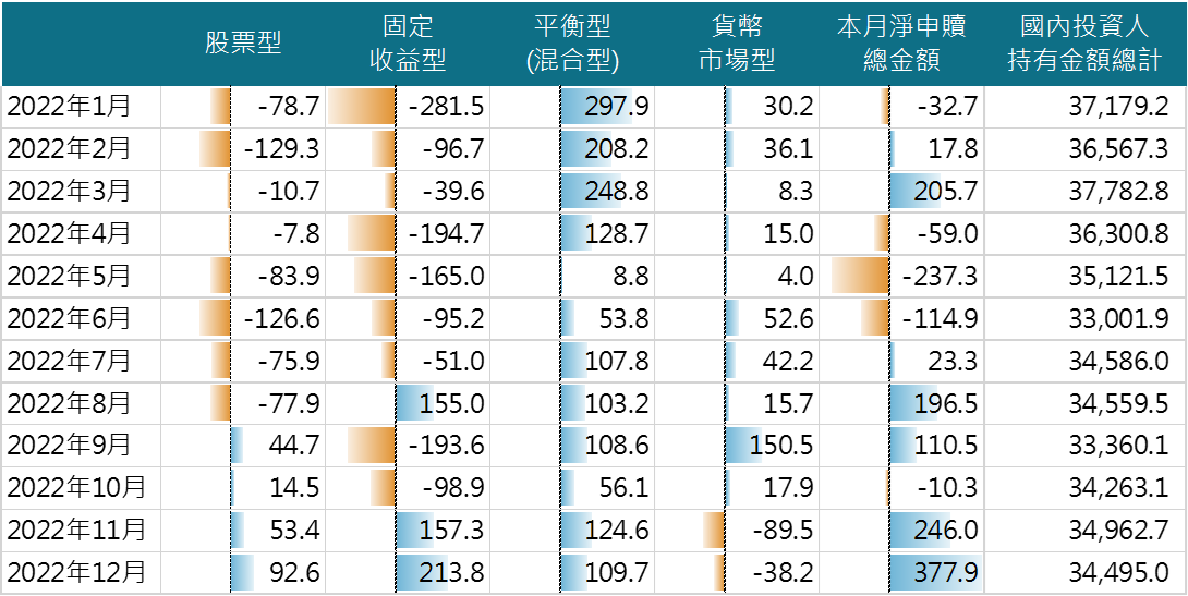 觀察整2022年整年度的基金淨申贖變化,可發現上半年市場恐慌的情況下,資金大多為淨贖回,其中以受美國公債殖利率上升影響為深的固定收益型(債券型)為主要贖回對象;下半年則隨著通膨觸頂、美國經濟數據差,預期FED放緩升息的情勢下,股債市回溫,資金開始轉為淨申購,其中以11月、12月底創下2022年以來最大淨申購金額,分別為246億元和377.9億元,資金主要集中在債券型基金,分別為157.3億元和213.8億元。