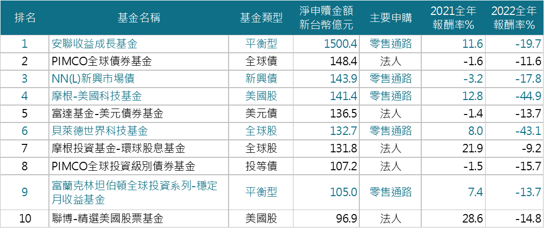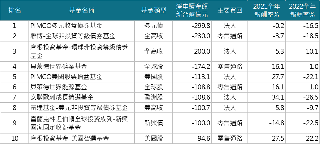 2022年是股債雙殺的一年,在歷史上並不常見,其中以風險性資產跌幅最深,從淨贖回的前10大基金表可發現,非投資等級債 (舊稱全球高收益債、美國高收益債)和新興債、美國股和歐洲股遭散戶和法人認賠殺出。