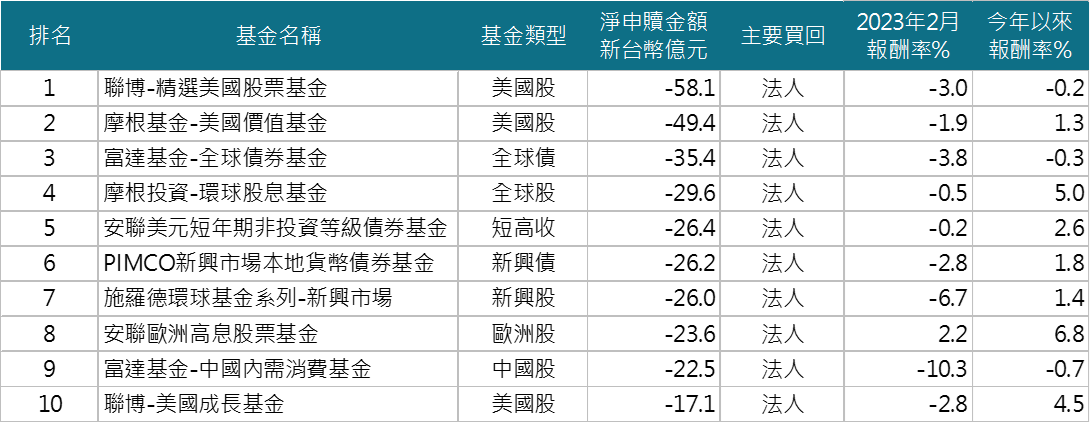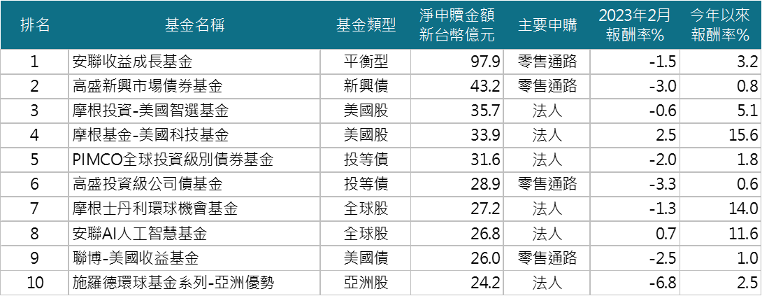 境外基金2023年2月淨買回基金Top 10